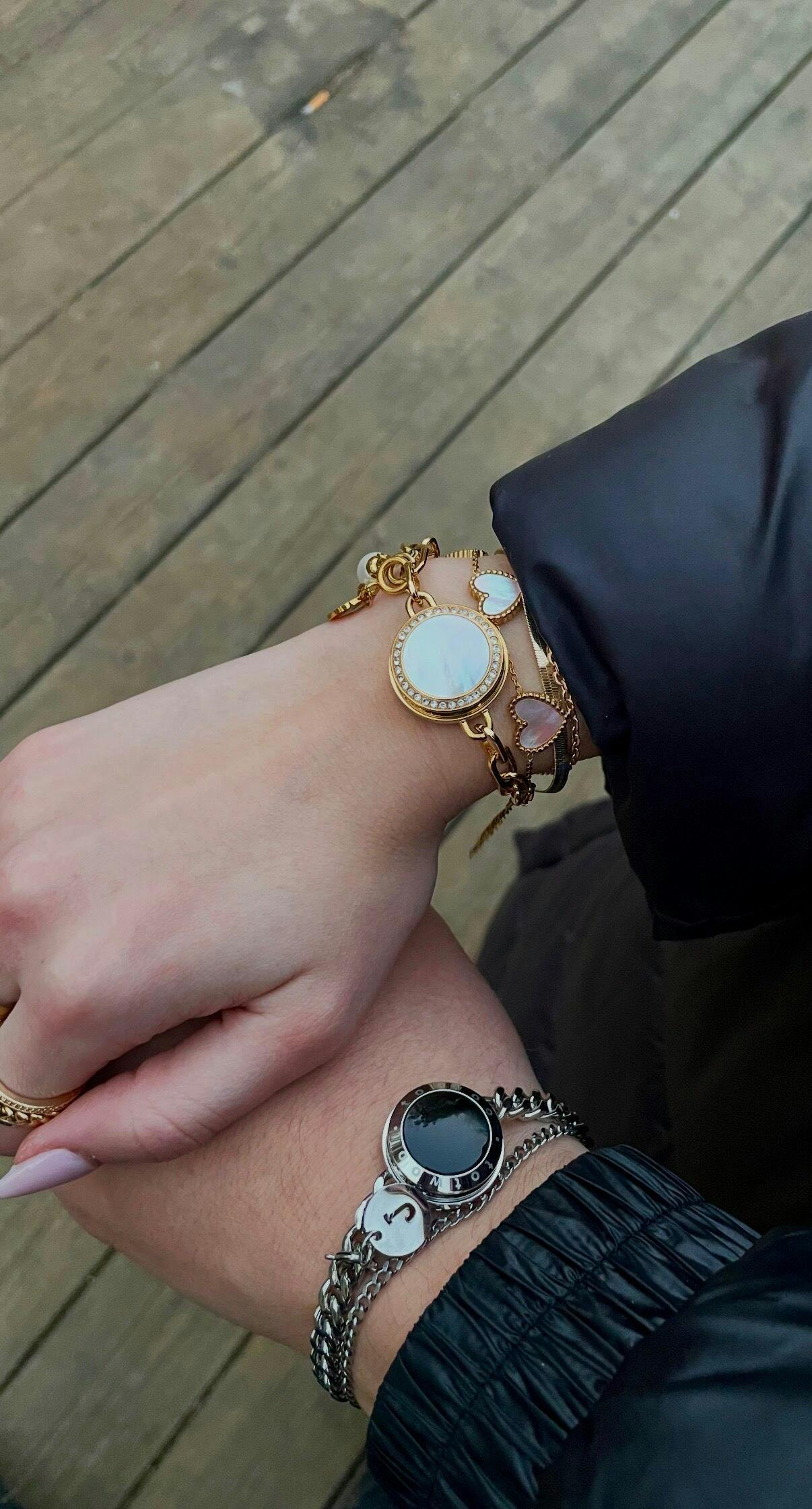 Touch-armbåndene kombinerer tidløst design med moderne innovasjon. Den sølvfargede kubanske kjeden med svart obsidian og den gullfargede Figaro-kjeden med perlemor skaper en balansert kontrast – en subtil blanding av kraft og eleganse.