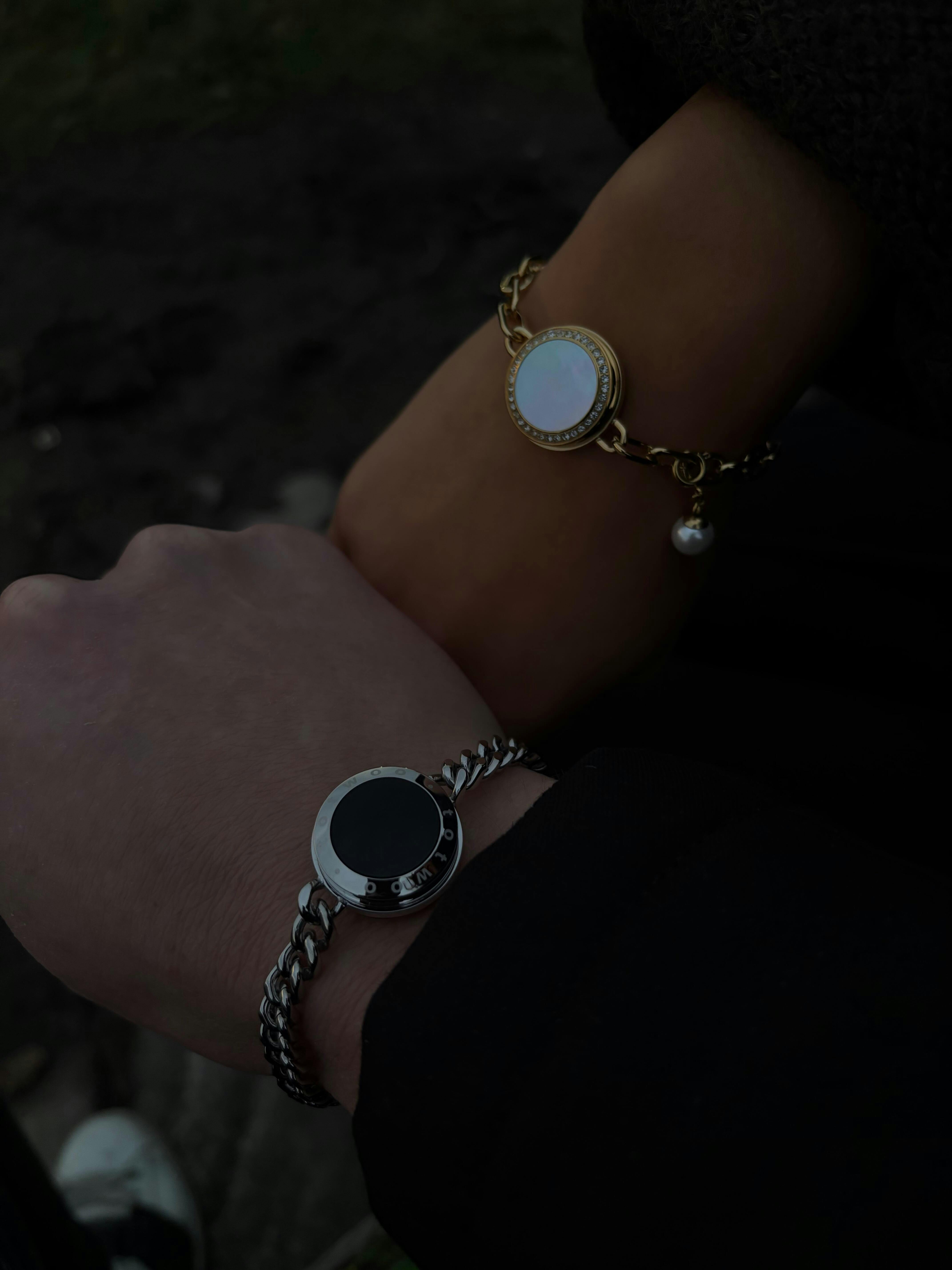 Toucharmbanden förenar tidlös design med modern innovation. Den silverfärgade kubanska kedjan med svart obsidian och den guldfärgade Figaro-kedjan med pärlemor skapar en balanserad kontrast – en subtil blandning av kraft och elegans.